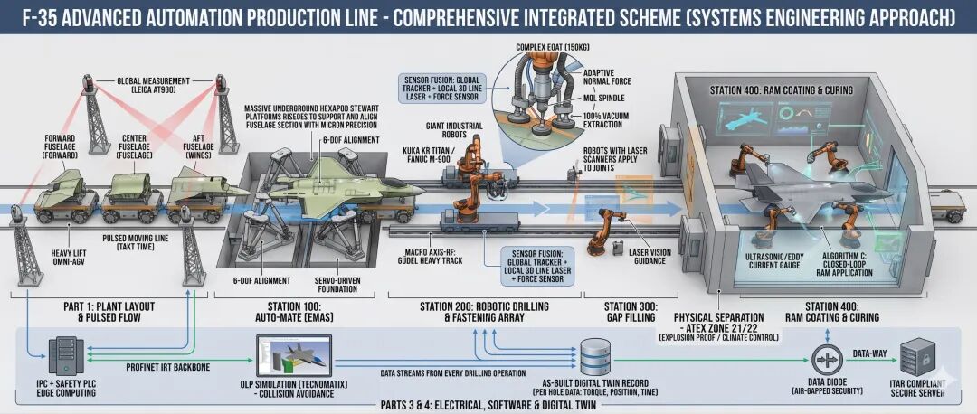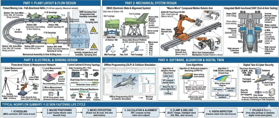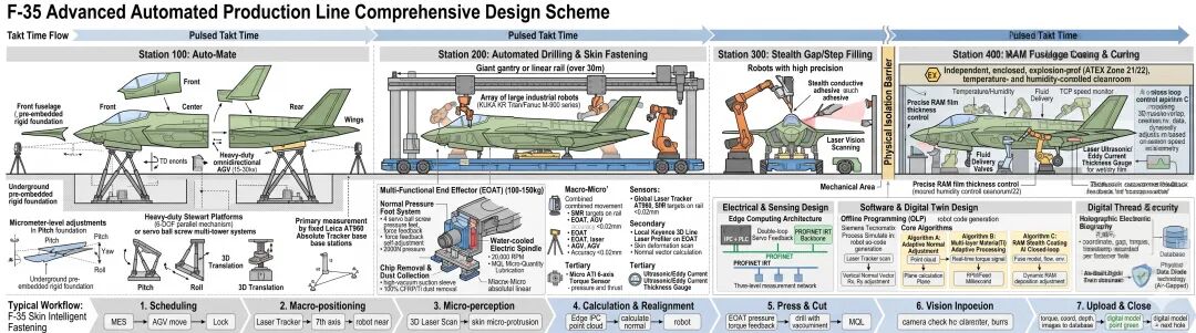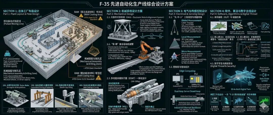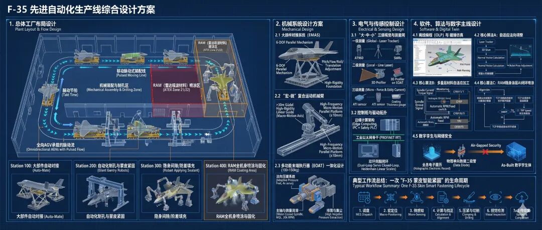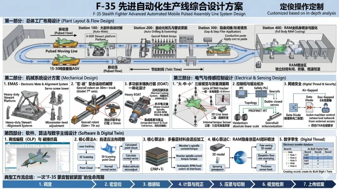 这是一份为F-35隐身战斗机量身定制的机器人与自动化产线机械、电气、软件及整体布局方案设计书。