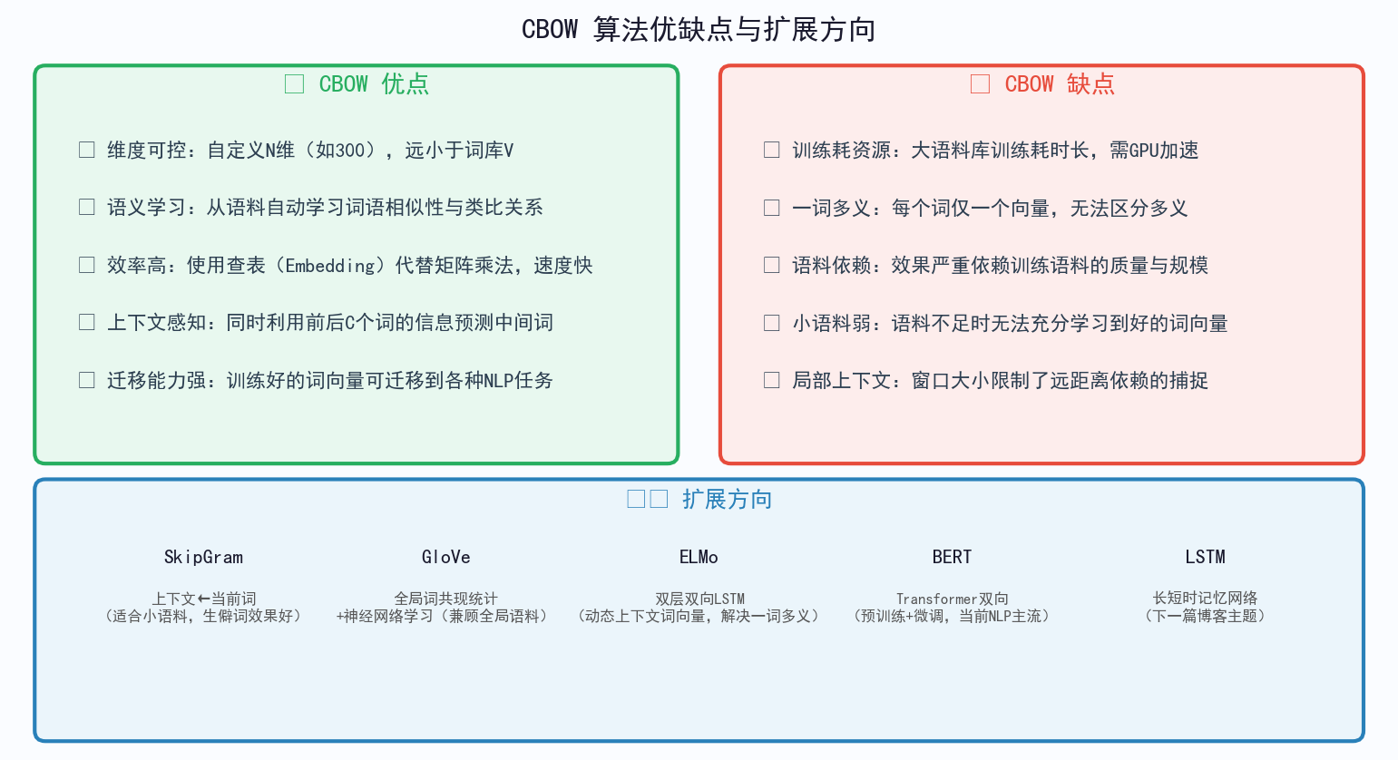 五、CBOW 优缺点总结与扩展方向