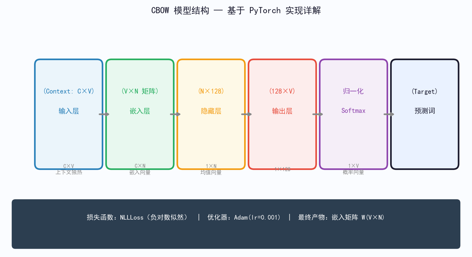 输出:概率最大的词 → 反向传播更新 WV×N 嵌入矩阵