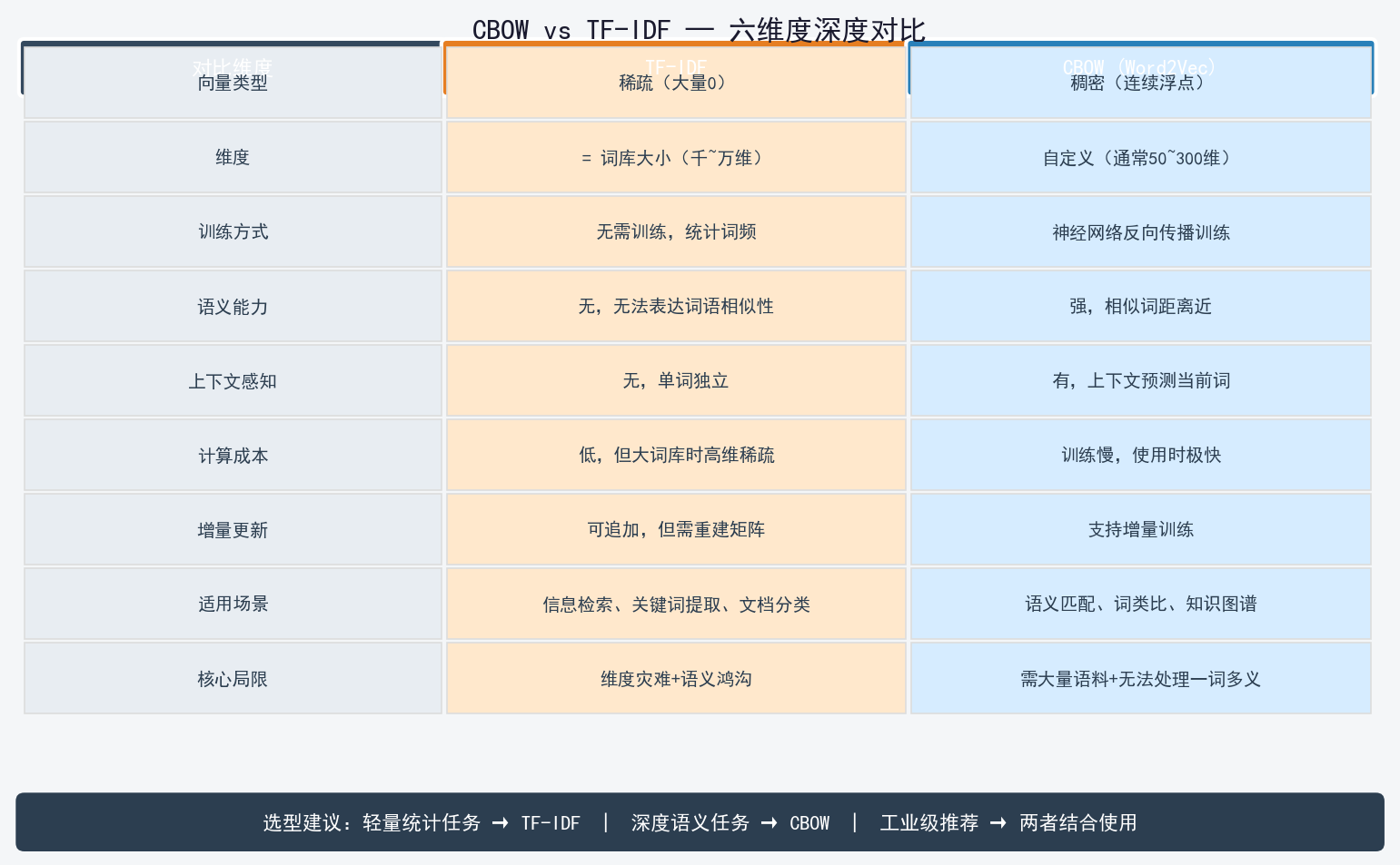 四、CBOW vs TF-IDF:六维度深度对比