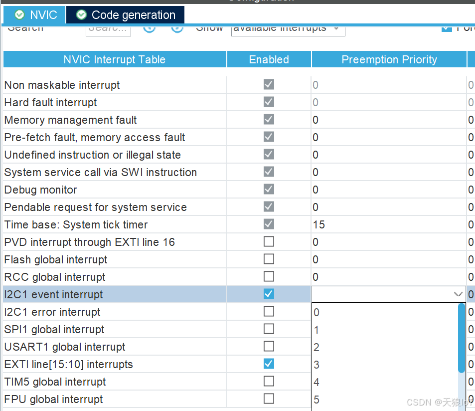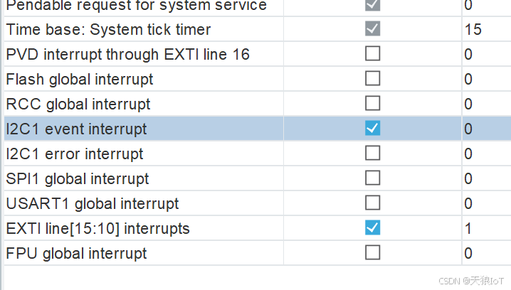 - 开启的外设都会显示在"NVIC"配置界面,首先需要勾选来使能中断,比如下面使能了I2C1和EXTI15_10的中断。