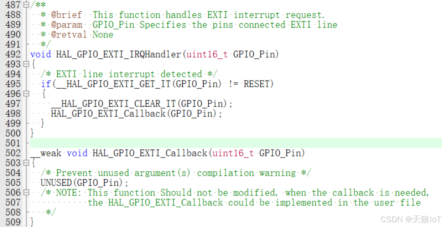 - 通用中断处理函数会在内部调用中断回调函数,而中断回调函数又是可以重新实现的弱函数,所以如果需要对某组中断处理做一些通用的操作可以通过重写中断回调函数来实现。