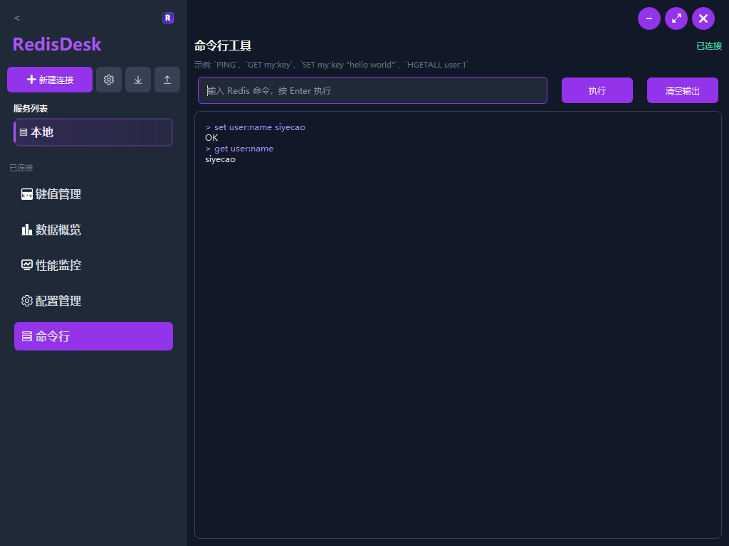 RedisDesk 是一个基于 Qt Widgets 的桌面端 Redis 管理工具,面向日常开发、调试和运维场景,提供连接管理、键值浏览、数据编辑、数据概览、性能监控、配置管理和内置命令行等能力。