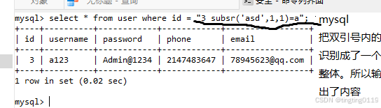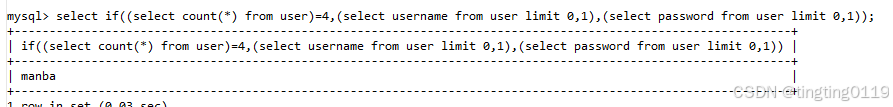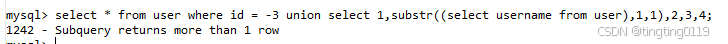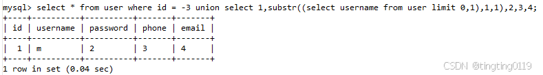 mysql> select substr((select username from user limit 0,1),1,2);