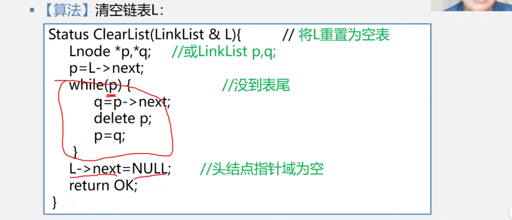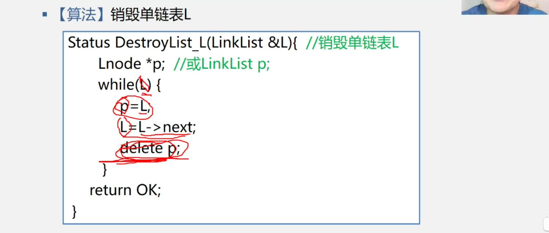 算法思路:从头指针开始,依次释放所有节点。逻辑是用临时指针p保存当前节点,让L先移动到下一个节点,再删除p指向的节点,循环执行直到所有节点(包括头节点)都被释放销毁。
