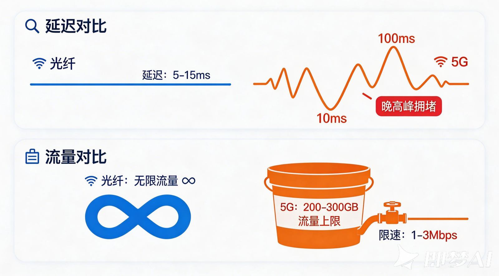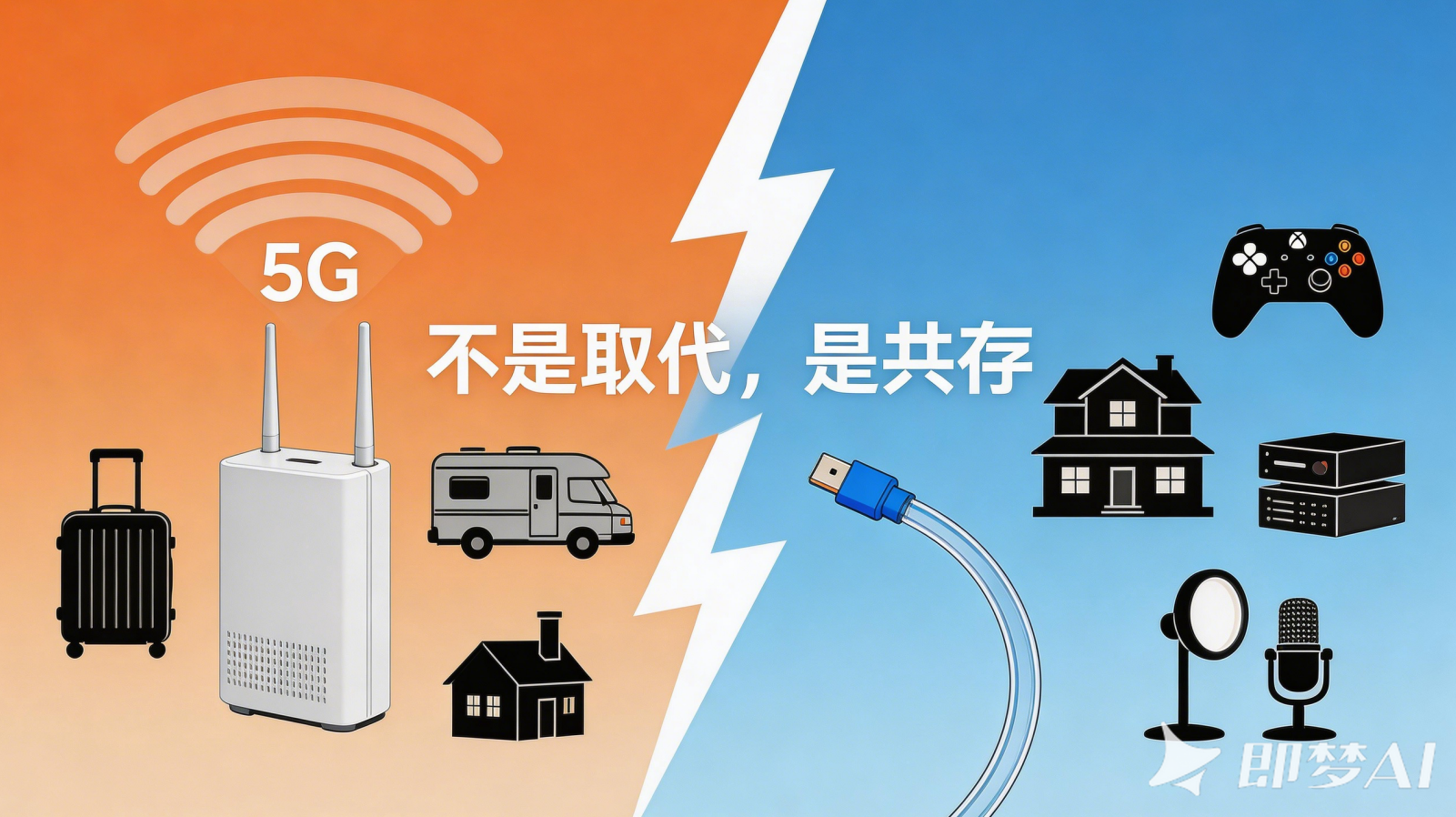 | 设备成本 | 初装费 300-500 元,光猫和路由器通常免费送 | 家用级 5G CPE 一次性 300-800 元,好一点的 1000+ |