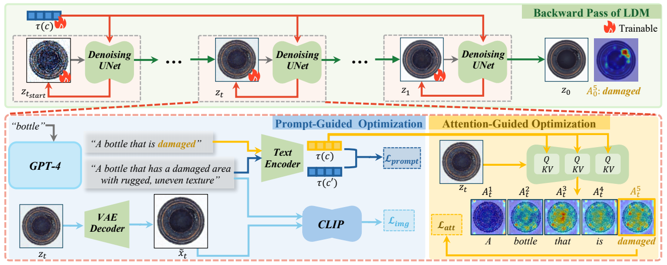 AnomalyAny的核心逻辑是:不"无中生有"生成缺陷,而是"精准编辑"正常图生成缺陷------基于冻结的Stable Diffusion,通过两大核心模块改造,让模型只在指定Mask区域、按照文字描述、生成与原图完美融合的缺陷。