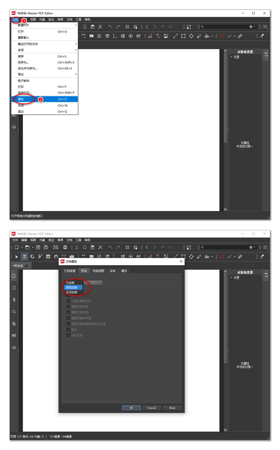 设置"用户密码"(打开文档需要密码)和"所有者密码"(限制打印、复制等权限)。