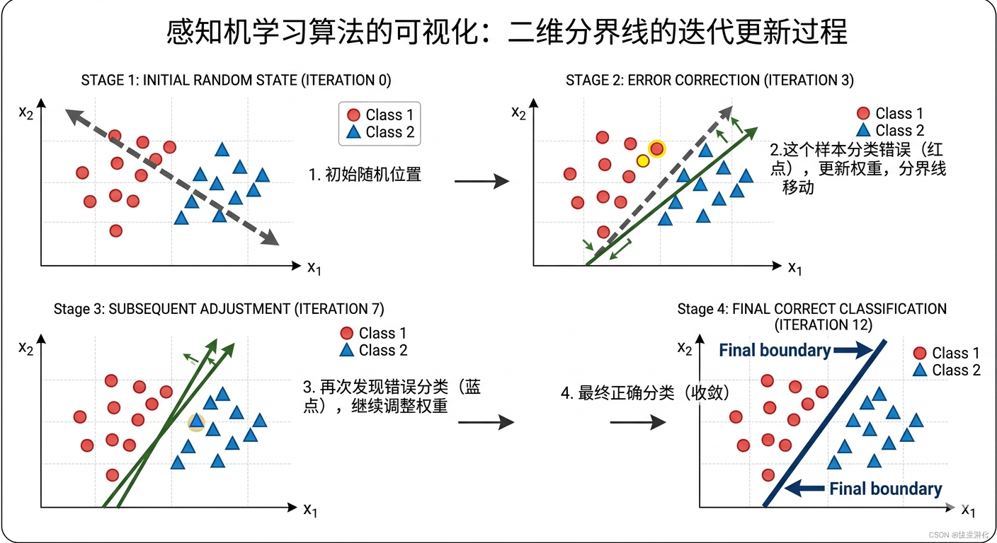 感知机的核心创新,不是网络结构(M-P 模型已经有了),而是学习规则。