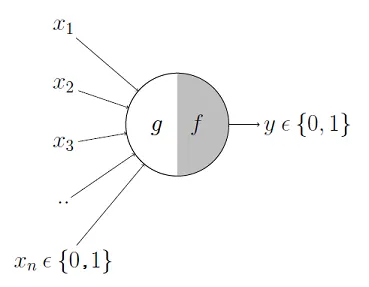 图 3.1:McCulloch-Pitts 神经元模型 ,它可以分为两个部分。第一部分 ggg 接收输入(相当于树突),执行聚合操作;基于聚合后的结果,第二部分 fff 做出决策。