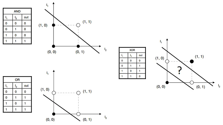 如果把这四个点画在二维坐标上((0,0)→0, (0,1)→1, (1,0)→1, (1,1)→0),你会发现:没有任何一条直线,能把输出为 0 的点和输出为 1 的点分开。