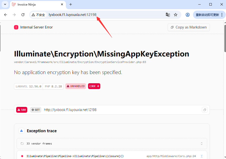 12,在外网电脑上,打开浏览器,在地址栏输入从路由侠生成的外网地址,就可以看到内网部署的 Invoice Ninja 登录界面了。