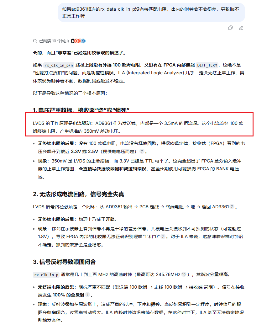 2026.04.16:我对比别的板卡引脚时发现如下问题:rx_clk_in_P相关的rx端都需要开启内部100Ω的匹配电阻,高速电路才能正常工作。修改后ILA出来了。