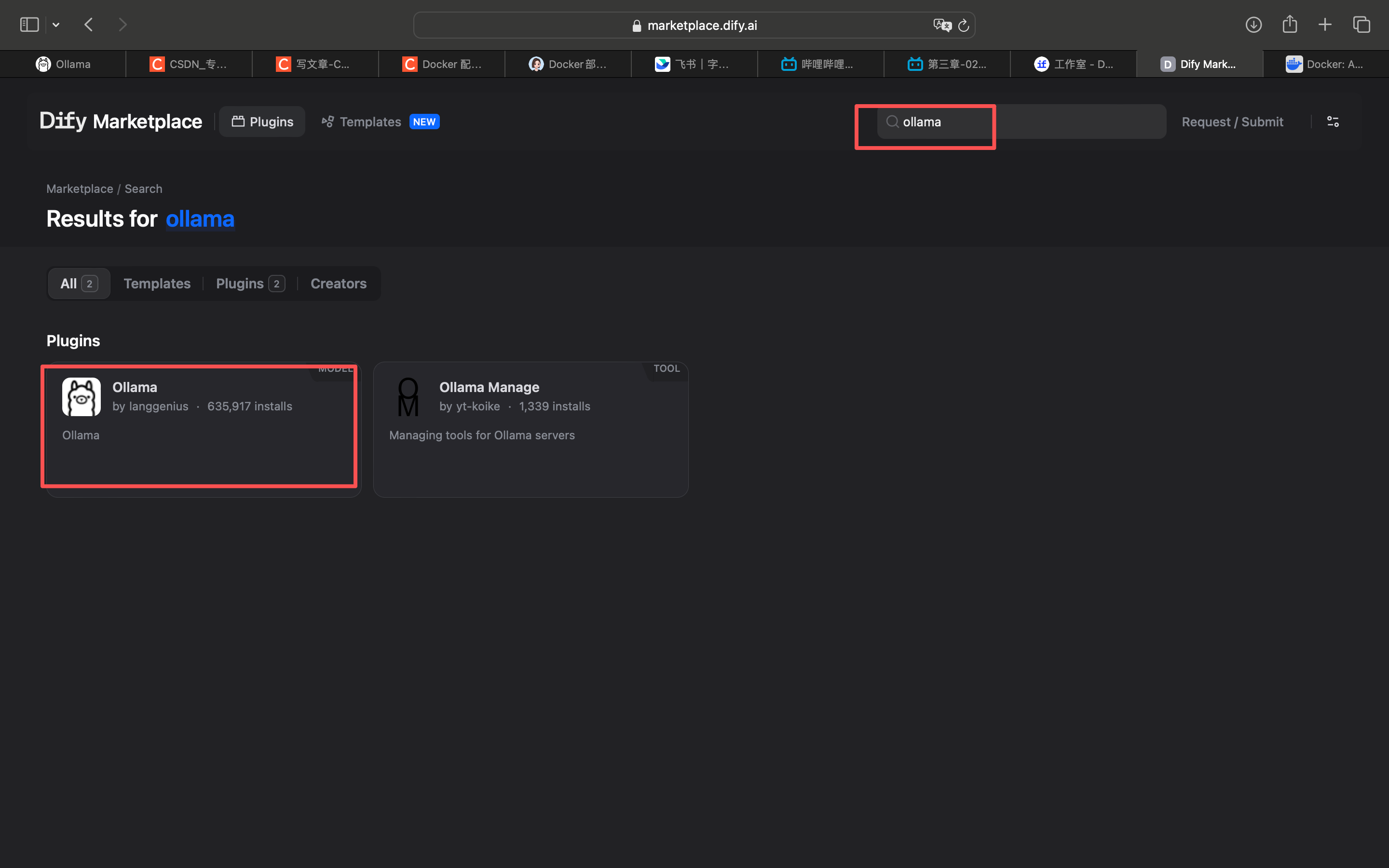 Ollama 插件地址:https://marketplace.dify.ai/search/all?q=ollama