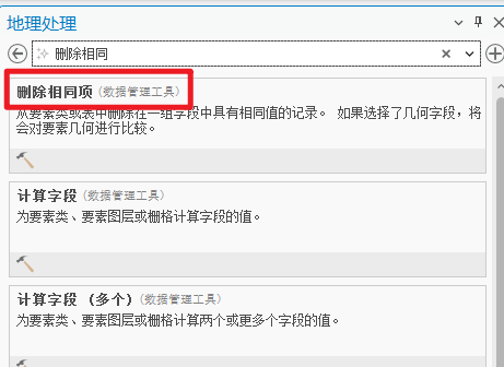 1.操作前务必备份原图层,避免误删数据无法恢复。在地理处理窗格搜索删除相同项,打开工具面板。