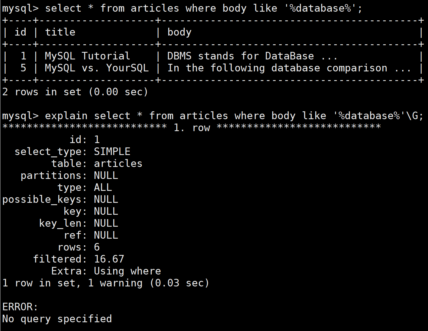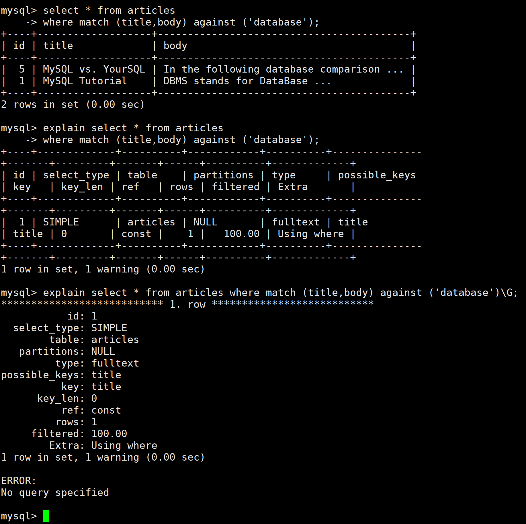 如果使用如下查询方式,虽然查询出数据,但是没有使用到全文索引: