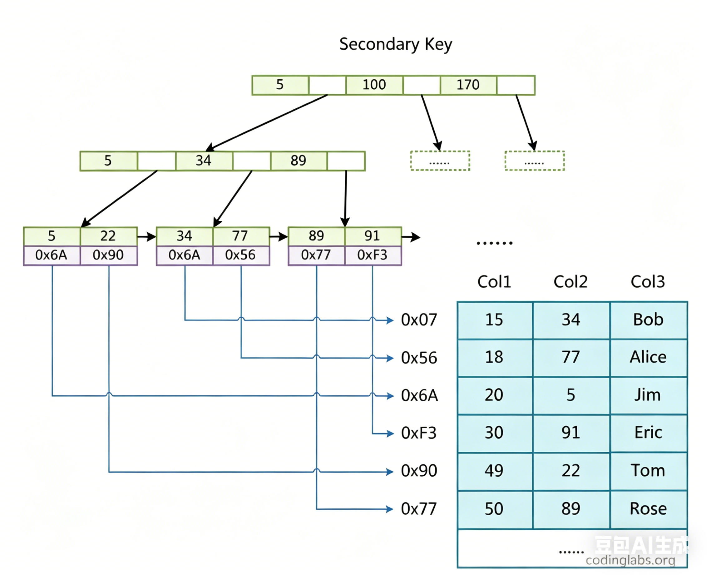 InnoDB 除了主键索引,用户也会建立辅助(普通)索引,我们以上表中的 Col3 建立对应的辅助索引如下