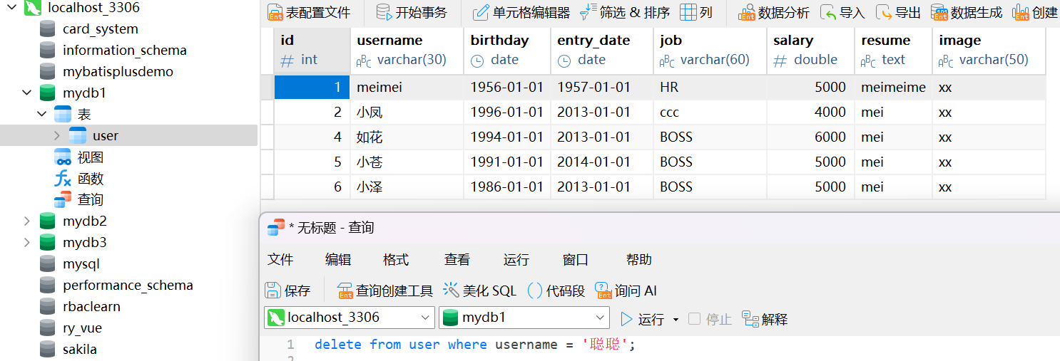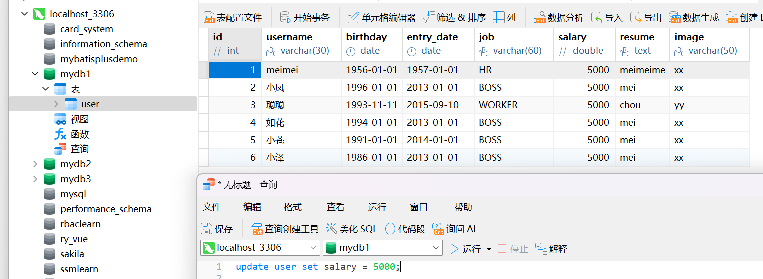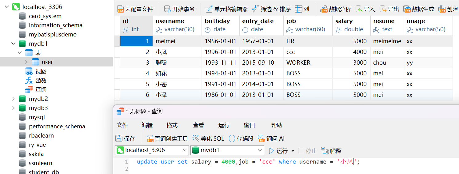 update user set salary = 4000,job = 'ccc' where username = '小凤';