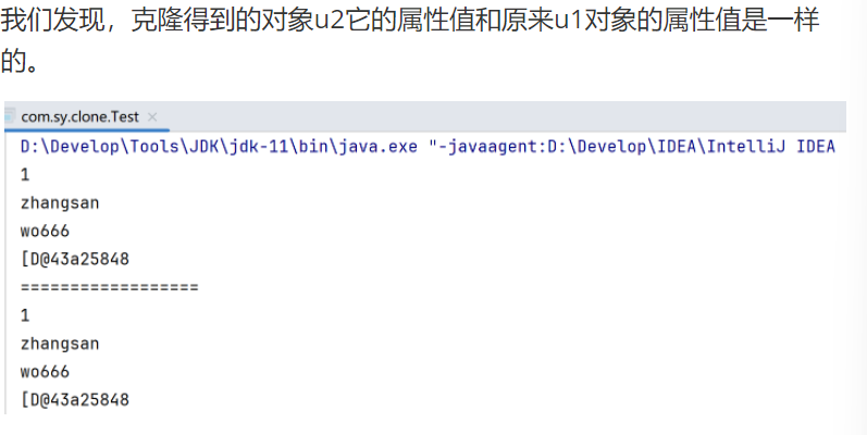 上面演示的克隆方式,是一种浅克隆的方法,浅克隆的意思:拷贝出来的对象封装的数据与原对象封装的数据一模一样(引用类型拷贝的是地址值) 。如下图所示