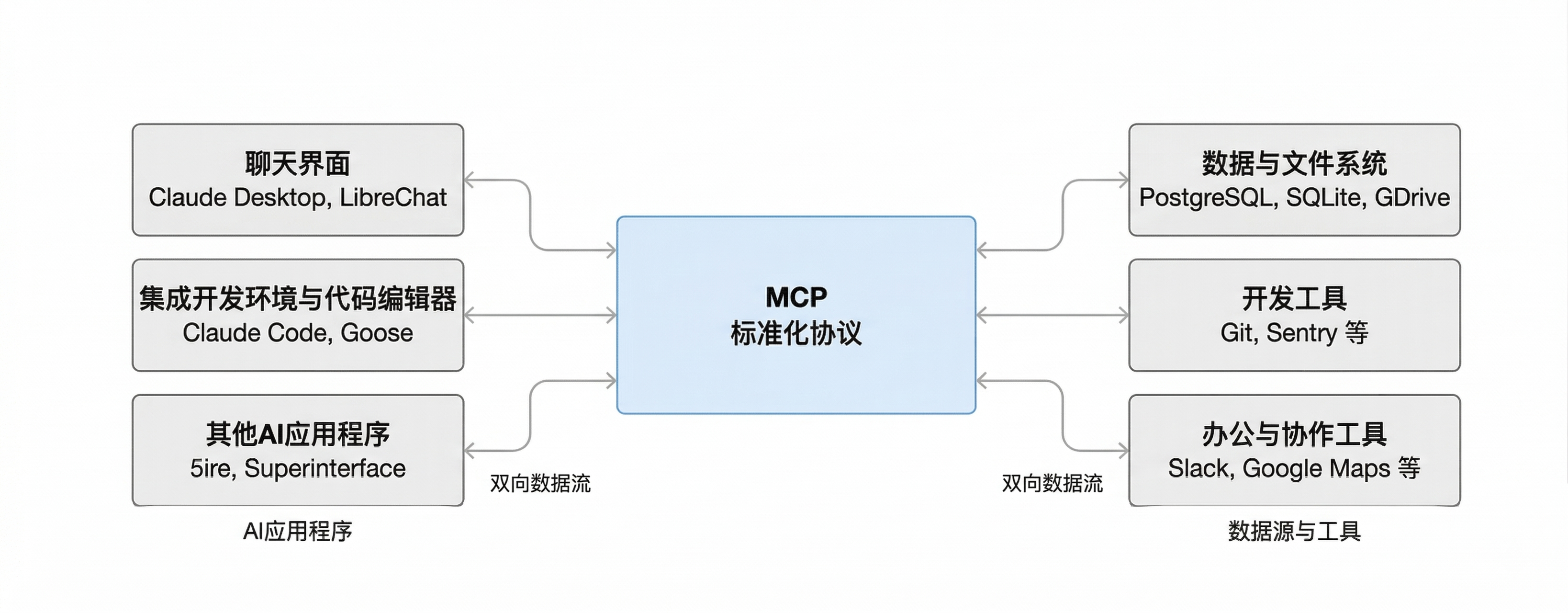 借助MCP,AI大模型可以连接到数据源(例如本地文件、数据库)、工具(例如搜索引擎、计算器)和工作流程(例如专门的提示),从而使它们能够访问关键信息并执行任务。