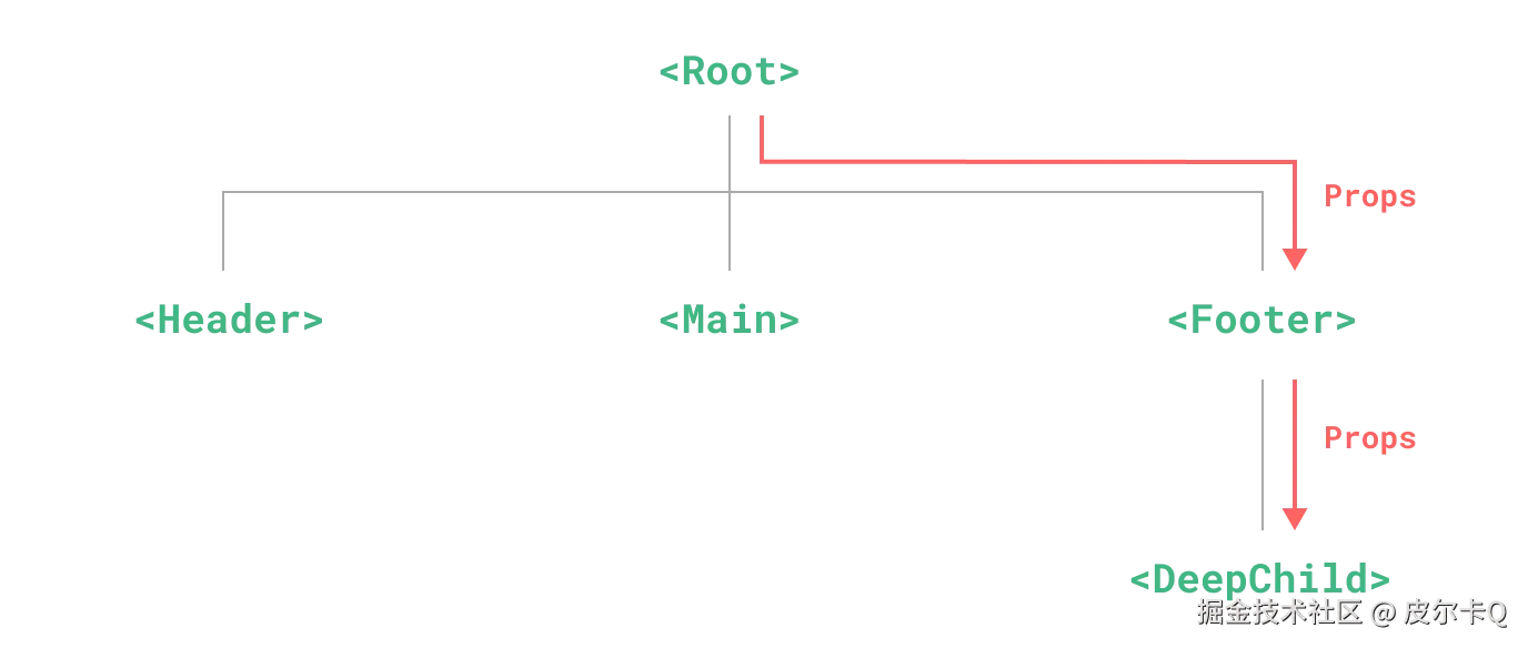 对于情景 1,一个可行的办法是将共享状态"提升"到共同的祖先组件上去,再通过 props 传递下来。然而在深层次的组件树结构中这么做的话,很快就会使得代码变得繁琐冗长。这会导致另一个问题:Prop 逐级透传问题。
