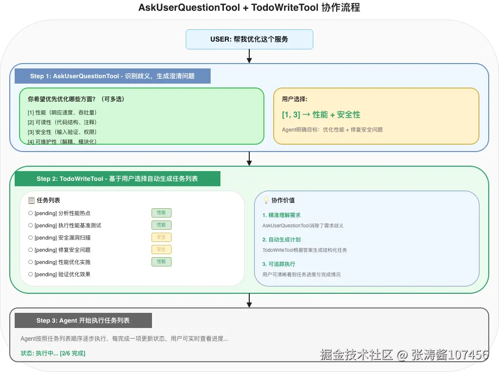 当用户的选择会影响任务列表时,AskUserQuestionTool可以触发TodoWriteTool的更新: