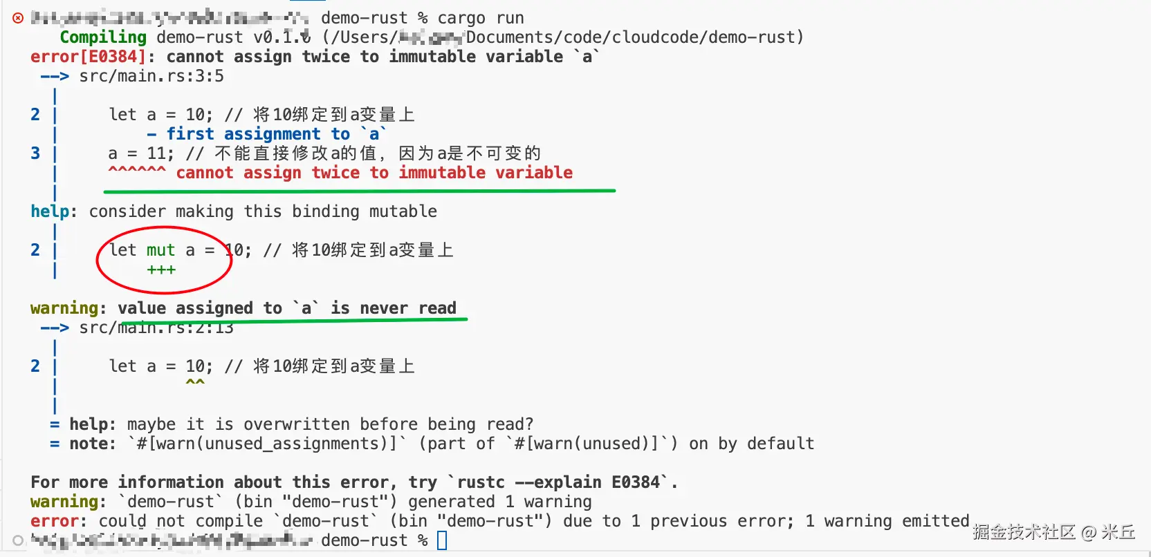 Rust 变量最显著的特点:默认是不可变的(immutable) 。这意味着一旦绑定了一个值,就不能改变它。