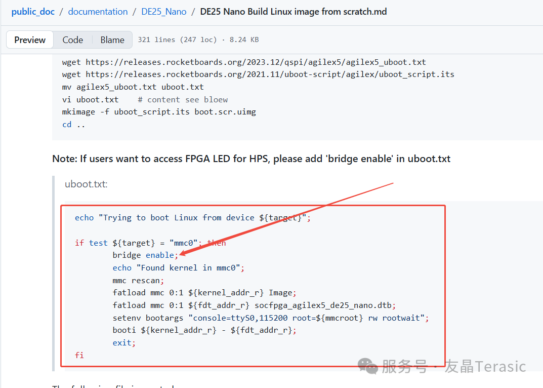 友晶官方发布的de25_nano_revA_sdcard_console_v1.1.zip 制作步骤https://github.com/johnnyfan1979/public_doc/blob/main/documentation/DE25_Nano/DE25%20Nano%20Build%20Linux%20image%20from%20scratch.md中,Uboot脚本有如下这些内容: