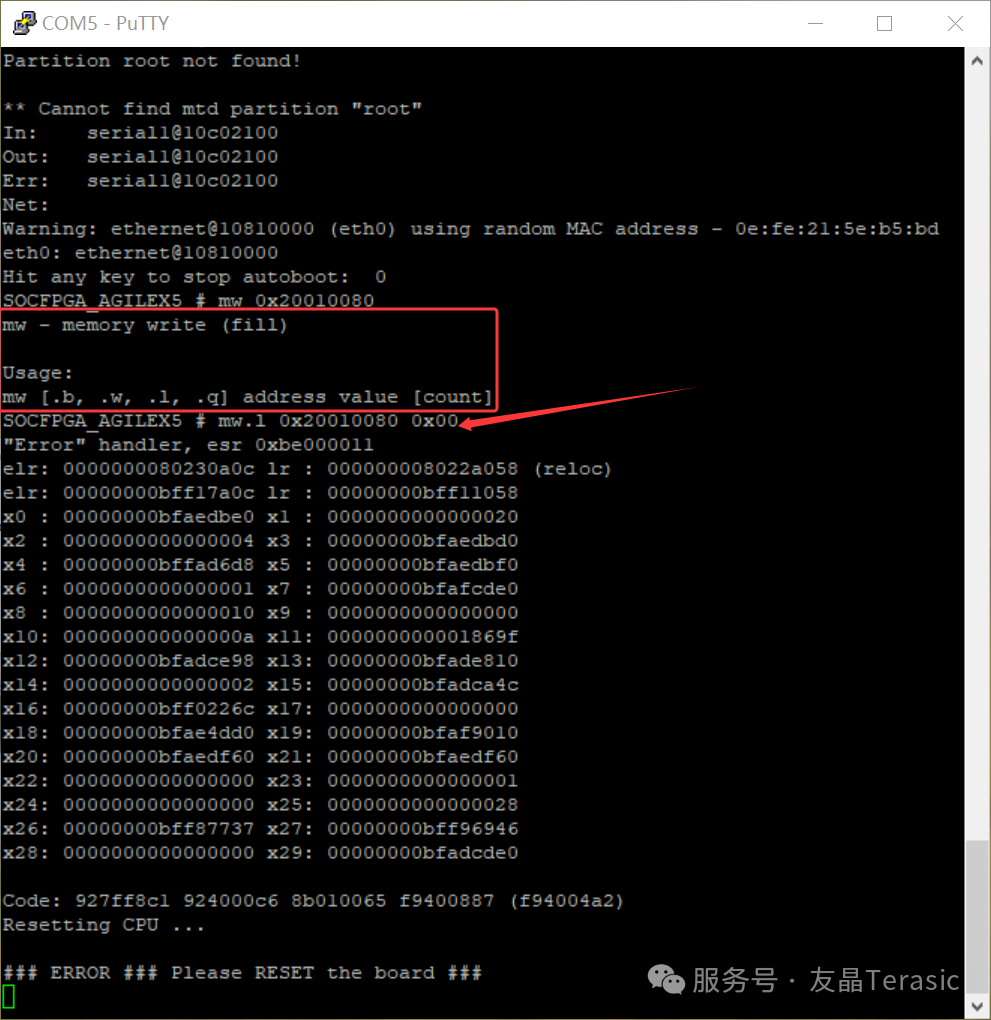 在DE25-Nano开发板上启动de25_nano_revA_sdcard_console_v1.1.zip镜像,在Uboot阶段按键盘任意键进入Uboot命令行输入环境,当使用mw.l 0x20010080 0x00命令写寄存时遇到这些提示: