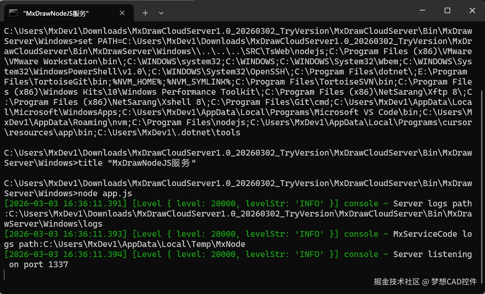 Windows系统:双击MxDrawCloudServer/Mx3dServer.exe,点击"开始Web服务",自动启动1337端口(Bin/MxDrawServer/Windows/app.js驱动)的CAD核心引擎服务。