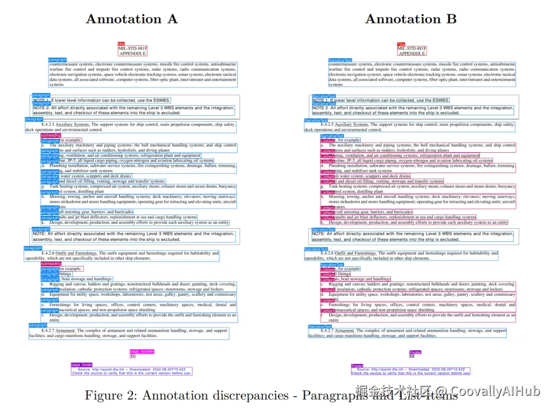 空间不一致 。即使在共享的类别之间,标注框的空间范围也差异悬殊。例如,table区域在Unstructured中比DocLayNet大5.2倍 ,page_footer框大6.3倍 ,subheading框大4.7倍。这意味着同一个段落,一个数据集可能标注为包含周围空白的粗粒度块,另一个数据集则标注为与OCR边界对齐的细粒度框。