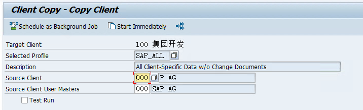 在我们的sap部署好之后默认会有一个000的客户端,但是我们实际使用的过程中会复制到对应的客户端进行相应的区分与隔离,通常开发100、测试200/300、生产-800