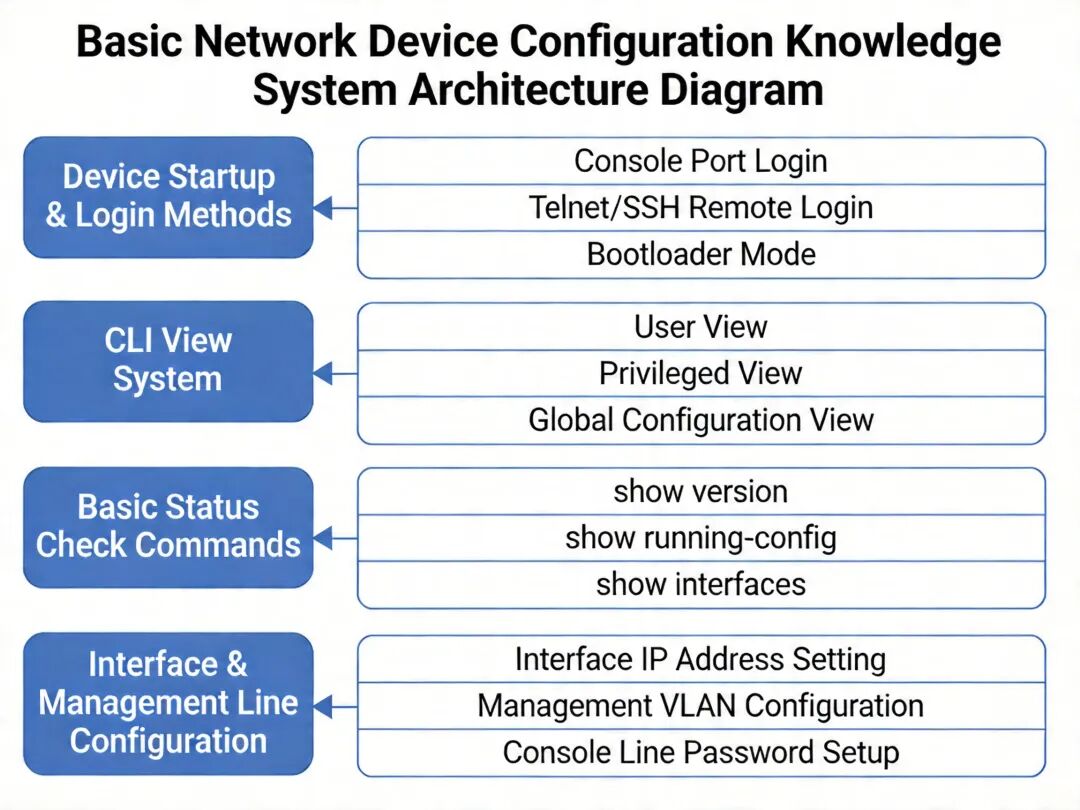 本文系统梳理华为网络设备的配置入门全流程,包含设备启动与登录方式、命令行视图体系、基础状态查看命令、接口与管理线路配置四大核心模块,所有内容均符合《软考网络工程师考试大纲》对设备配置的能力要求。
