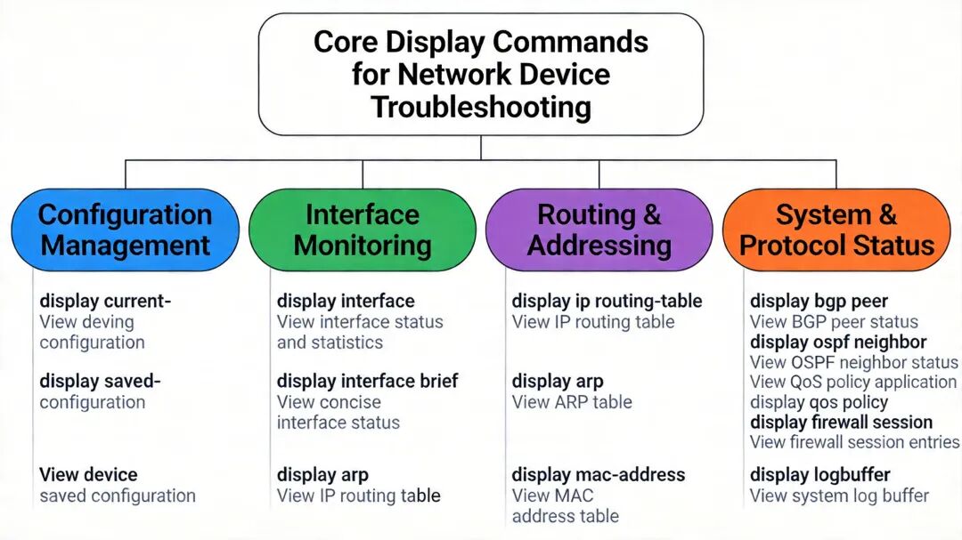 核心 display 命令覆盖状态查看、故障排查全场景,需熟练掌握每个命令的功能与输出含义。