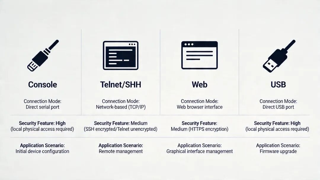 网络设备支持四类管理登录方式,不同方式的技术要求与适用场景存在明确差异,是软考选择题与案例题的高频考点: