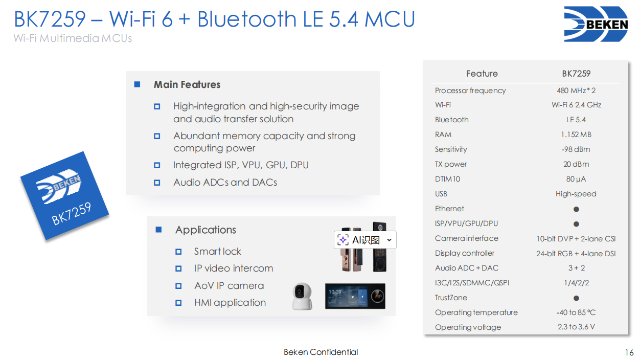 BK7259是一款高度集成的单频2.4 GHz Wi-Fi 6(802.11b/g/n/ax)和双模蓝牙5.4组合解决方案,并率先集成ARM Ethos-U65 microNPU,为边缘智能设备提供强大的本地AI算力。 BK7259是一款高度集成的芯片,具备强大的硬件配置,将多种强大的功能集于一身。它集成了多个ARM处理器,主频最高可达1 GHz,还配备了音频ADC/DAC、ISP(图像信号处理器)、H264编解码、GPU(图形处理器)、DPU(显示处理器)以及NPU(神经网络处理器,BK7259Pro支持);可满足多样化的应用需求。同时,该芯片提供丰富的高速接口,比如MIPI CSI、MIPI DSI、高速USB、1Gbps Ethernet、SDIO和eMMC。 其中,BK7259集成的安防级ISP,能够对摄像头采集到的图像进行高效处理,提升图像的质量和清晰度。它支持2560×1440的分辨率,并且自带H.264编码功能,能够将采集到的图像数据进行高效压缩,减少数据传输量,降低网络带宽的占用,同时保证图像的清晰度和流畅度。 在无线连接方面,BK7259支持单频2.4GHz Wi-Fi 6(802.11b/g/n/ax)和双模蓝牙5.4组合解决方案,专为需要丰富资源和低功耗的应用而设计。这使得BK7259在网络连接的稳定性和速度上有着出色的表现,无论是在家庭环境中多个智能设备同时连接使用,还是在工业物联网等对网络要求较高的场景下,都能轻松应对,确保数据的快速、稳定传输。 在功耗方面,BK7259采用了先进的低功耗设计,具备除工作模式外多种低功耗模式,分别为关断模式、深度睡眠模式和睡眠模式。其中,睡眠模式功耗为43微安,深度睡眠模式功耗为16微安,关机模式下功耗仅为3微安。 在存储方面,BK7259集成超大的片内RAM,并且内部封装了高速DDR,且DDR容量可根据不同应用场景进行配置,为系统的稳定运行和数据处理提供了有力保障。 在性能优化方面,BK7259采用ARM Neon处理器,支持128位SIMD指令,这一特性显著提升多媒体信号处理和计算机视觉能力。此外,众多基于Neon重度优化的开源软件库,可助力用户开发高效率的机器学习和图像处理算法。 在安全保障方面,BK7259的安全体系符合PSA Level 2标准,具备全面的安全功能,如支持Root of Trust、安全启动、FLASH加密、关键信息加密存储、高吞吐量硬件加密和身份验证等,能够全方位保护用户知识产权和产品在各个生命周期的安全性。 凭借强大的性能表现,BK7259为配备大尺寸显示屏的智能门锁、IP视频对讲机、数码相框、AoV IP摄像机、人机界面应用以及其他先进物联网应用提供了高集成度和极低功耗的解决方案,有力推动了这些领域的技术发展和产品创新。 |