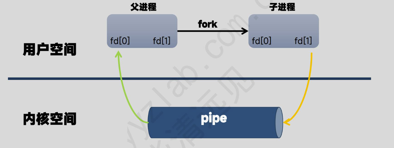 创建单向数据通道(半双工通信方式)。数据只能从读端 pipefd[0] 读取,从写端 pipefd[1] 写入,方向不可逆转;数据先写入内核缓冲区,再由读进程从内核缓冲区读取。 |