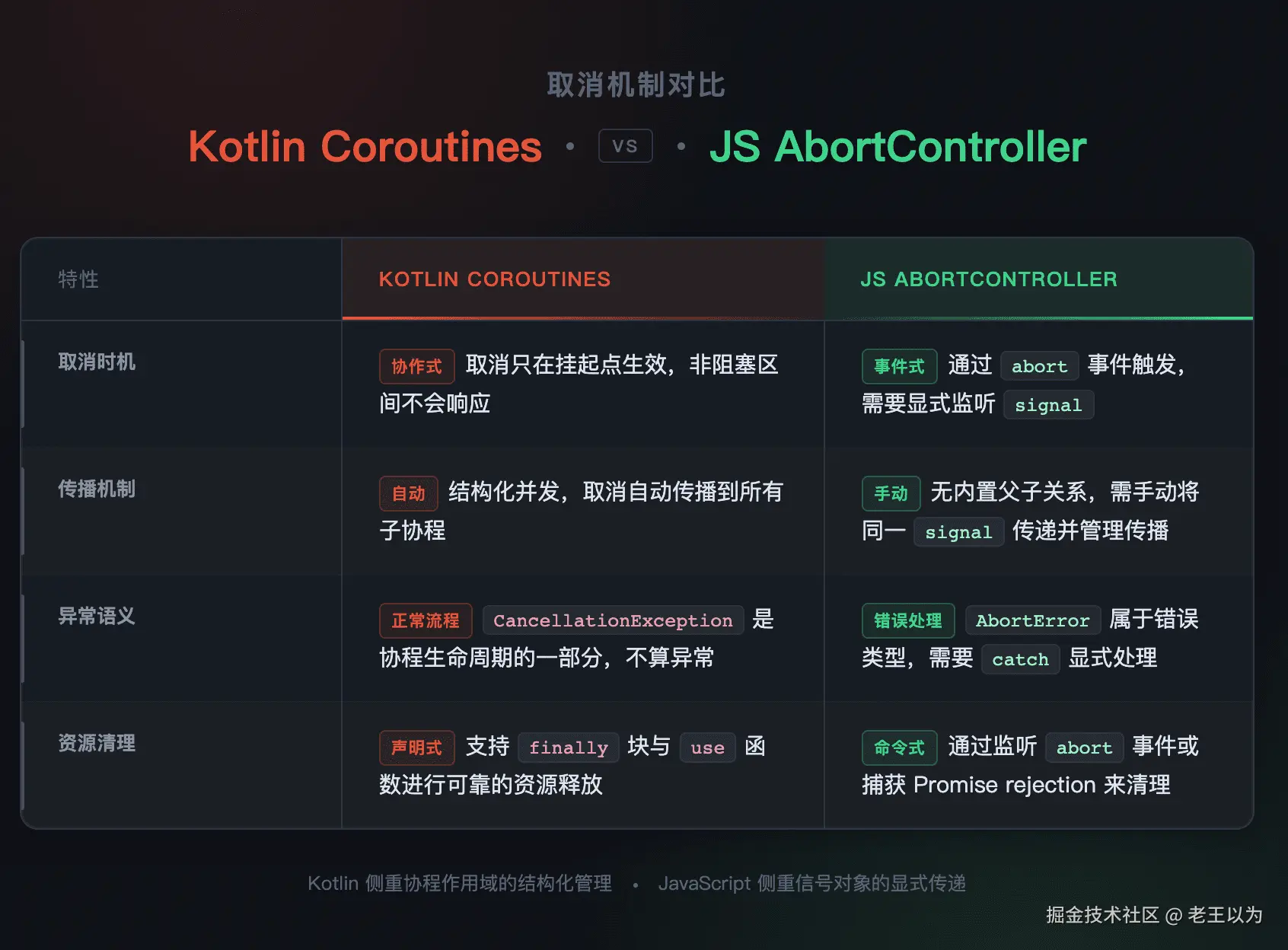 所有现代语言都选择了协作式取消 ,这不是偶然,而是对资源安全和状态一致性的共同追求。不同语言的实现方式反映了它们的核心抽象模型: