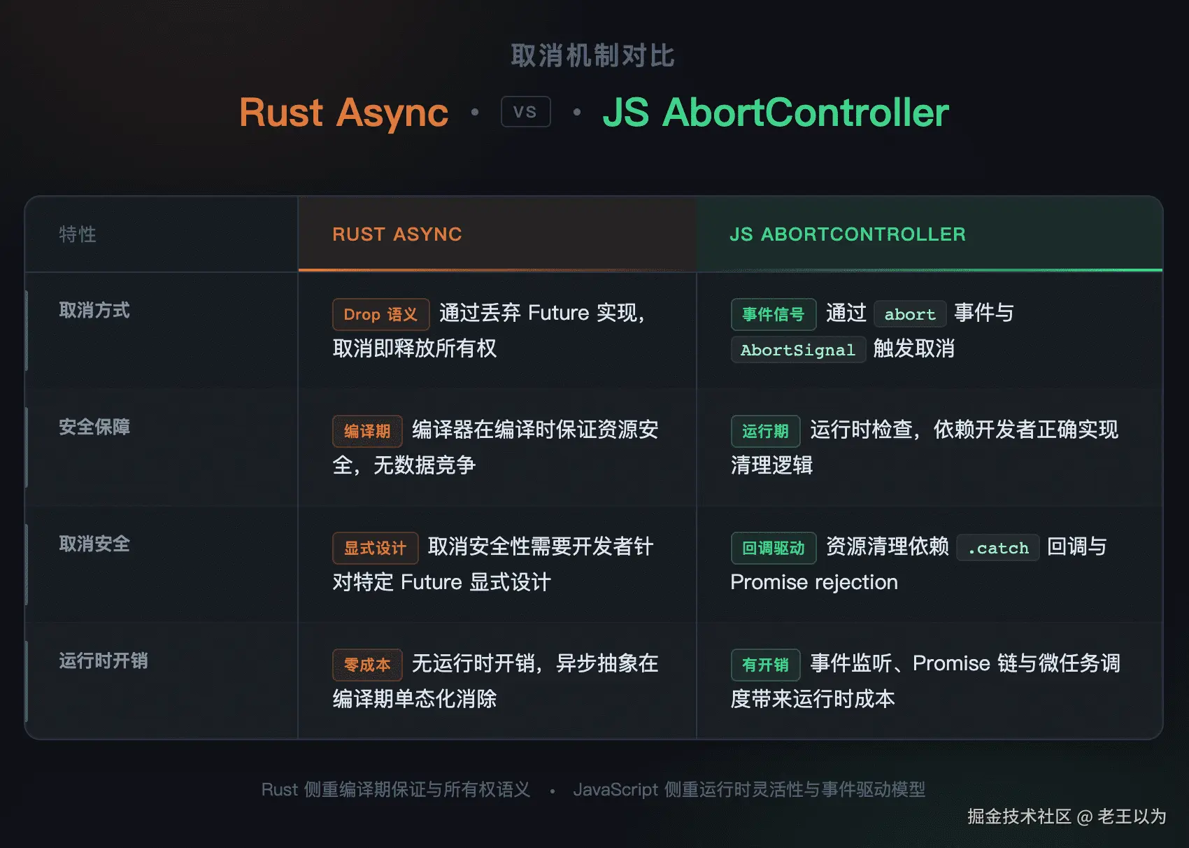 | Rust | 异步 Future + 轮询 | Drop 语义 |