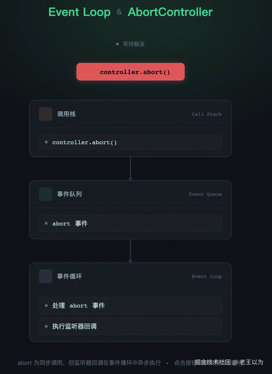这种设计使得 AbortController 与 JavaScript 的异步模型(Promise、async/await、EventTarget)无缝集成。