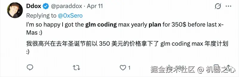 抢不到的人还在苦苦挣扎,先买的人已经在享受世界了。网友 @Ddox 多少有点炫耀成分:还好我去年就买了 GLM Max 年度会员。