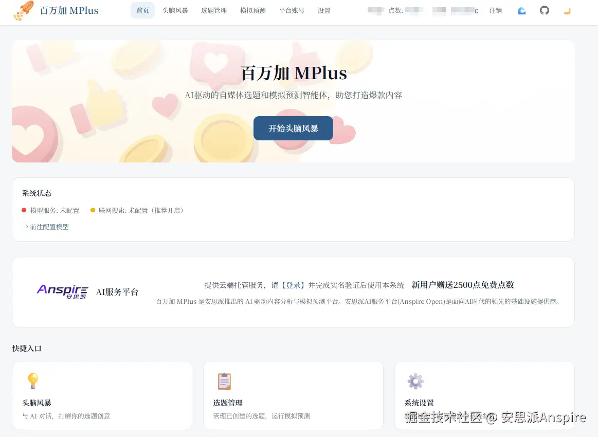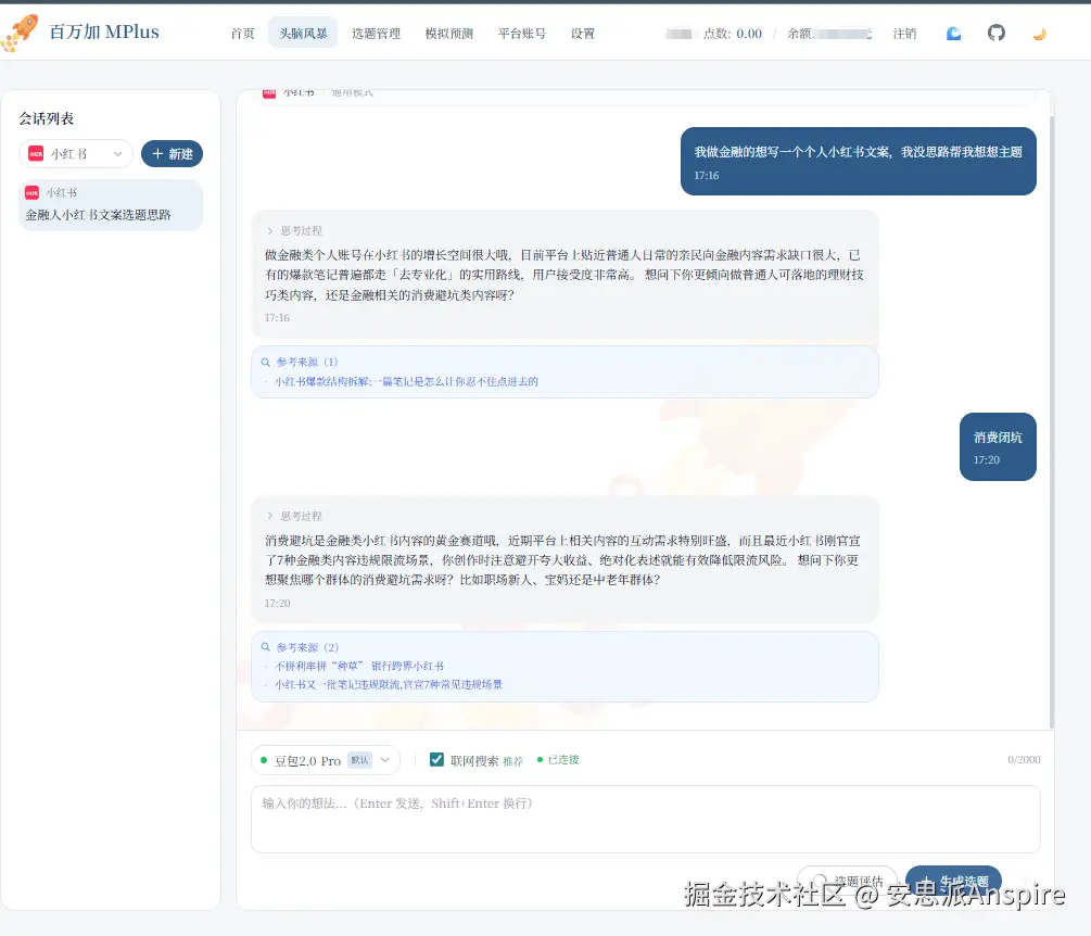 以 百万加 MPlus (mplus.anspire.cn/) 为例,其接入的 Anspire Search,在信息更新频率、结果质量以及抗内容注入能力方面,能够为内容团队提供更适合前期分析的输入基础。 对于企业内容场景而言,这类能力的价值不在于替代策划,而在于帮助团队提升信息输入的有效性,从而提高判断质量。