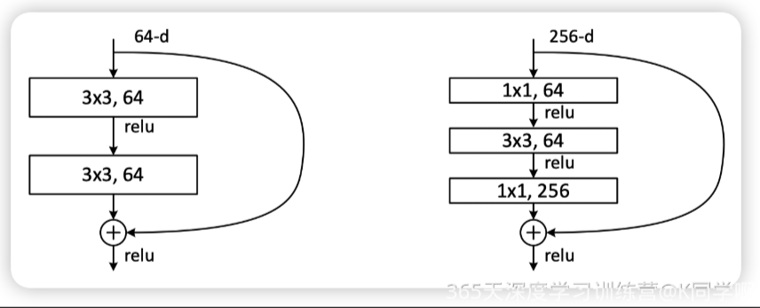 主要使用的残差单元有这两种,分别是两层的浅残差和3层的深残差。