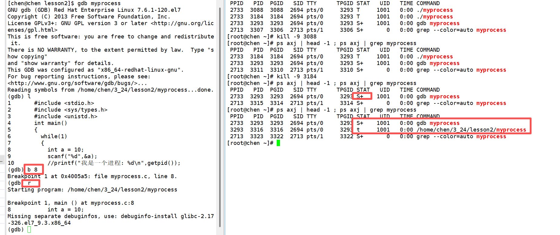 这个得以运行的程序的状态就是 t 跟踪停止状态。这就相当于父进程GDP先创建了一个子进程,遇到断点的时候,向子进程发起了kill 19号信号。