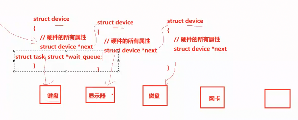 操作系统作为硬件的管理者,管理的方式还是我们之前讲过的:先描述,再组织。所以对于硬件来说,它也有对应的类似于 struct task_struct 一样的属性信息结构体。并且因为硬件不止一个,所以有 struct device *next 给链接起来,和我们在上篇文章中提到的操作系统底层的信息管理逻辑一样。同时还存在一个指向进程描述符类型的指针 :struct task_struct *wait_queue。