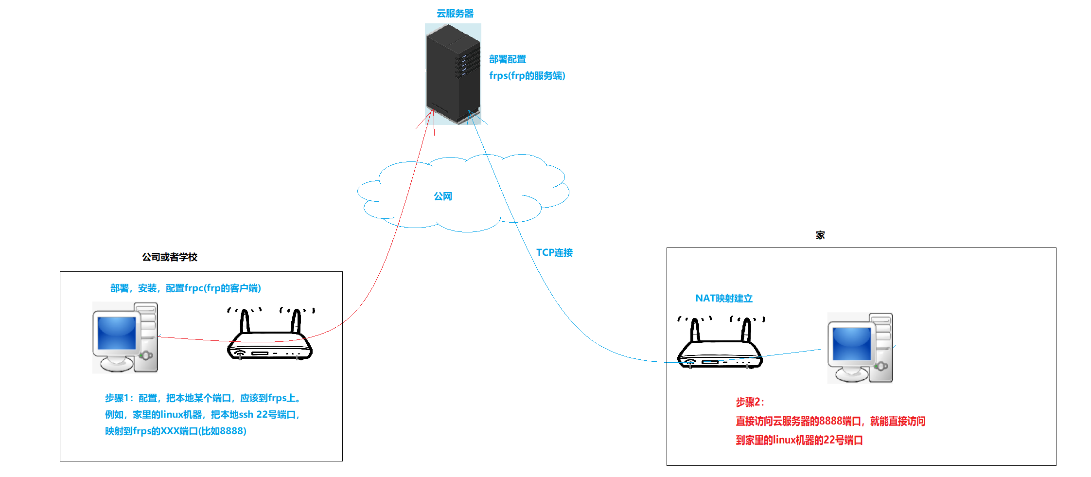 首先在拥有固定公网 IP 的云服务器上部署 frp 服务端 frps,同时在家庭内网的目标主机上部署 frp 客户端 frpc,由客户端主动向公网服务端发起 TCP 长连接,在家庭路由器上建立 NAT 映射,打通内网到公网的专属隧道,并配置端口映射规则,将本地 SSH 服务的 22 端口映射到云服务器的 8888 端口;完成配置后,处于公司或学校等外网环境的设备,只需直接访问云服务器的 8888 端口,公网服务端就会将流量通过预先建立的隧道转发给家庭内网的客户端,最终由客户端将流量转发到本地主机的 22 端口,从而实现外网设备对家庭内网主机的无障碍访问,解决了内网设备无公网 IP、无法被公网直接访问的问题。