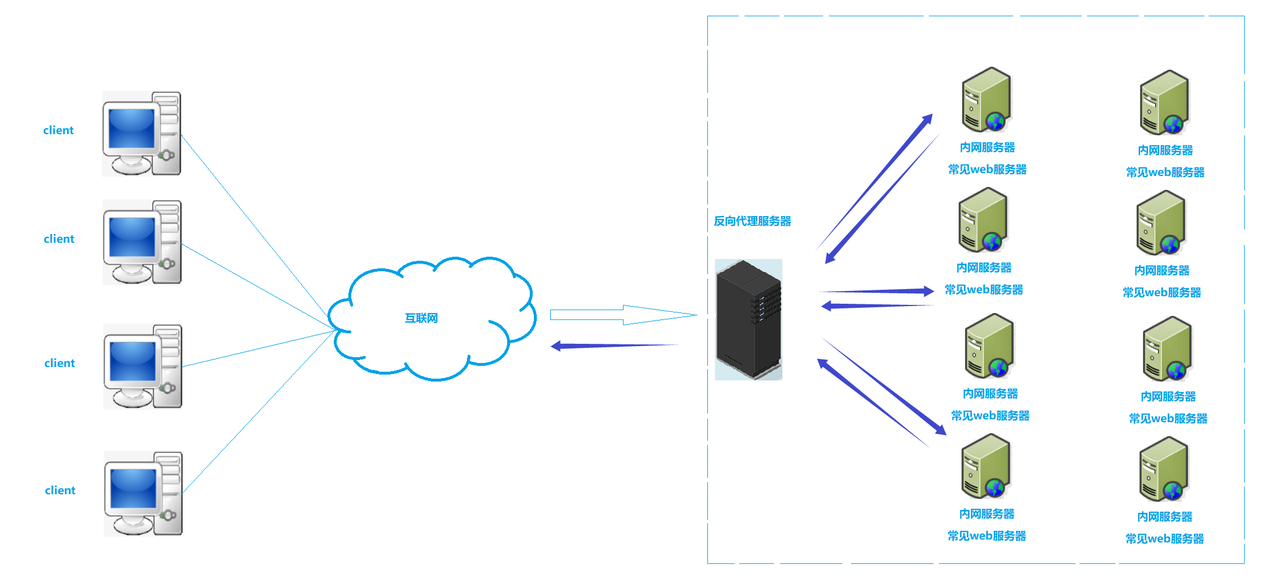 反向代理服务器用来给后端提供服务,它接收来自客户端的请求,并将这些请求转发给后端服务器,然后将后端服务器的响应返回给客户端。如下图所示:
