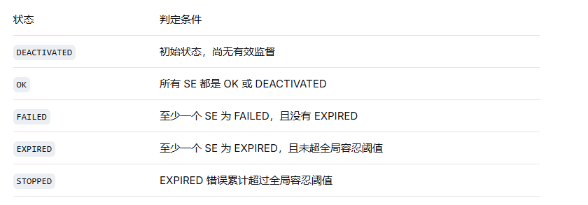 对于每个 SE,根据当前累积的证据,按照配置的监督规则计算其本地状态(OK / FAILED / EXPIRED / DEACTIVATED)。
