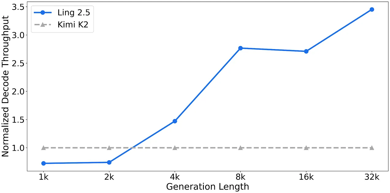 Ling 2.5 更注重长上下文效率,而非绝对的基准测试领先地位。据 Ling 团队表示,在 32k token长度下,其运行速度显著快于 Kimi K2,而这正是这类混合架构模型所追求的实际价值。