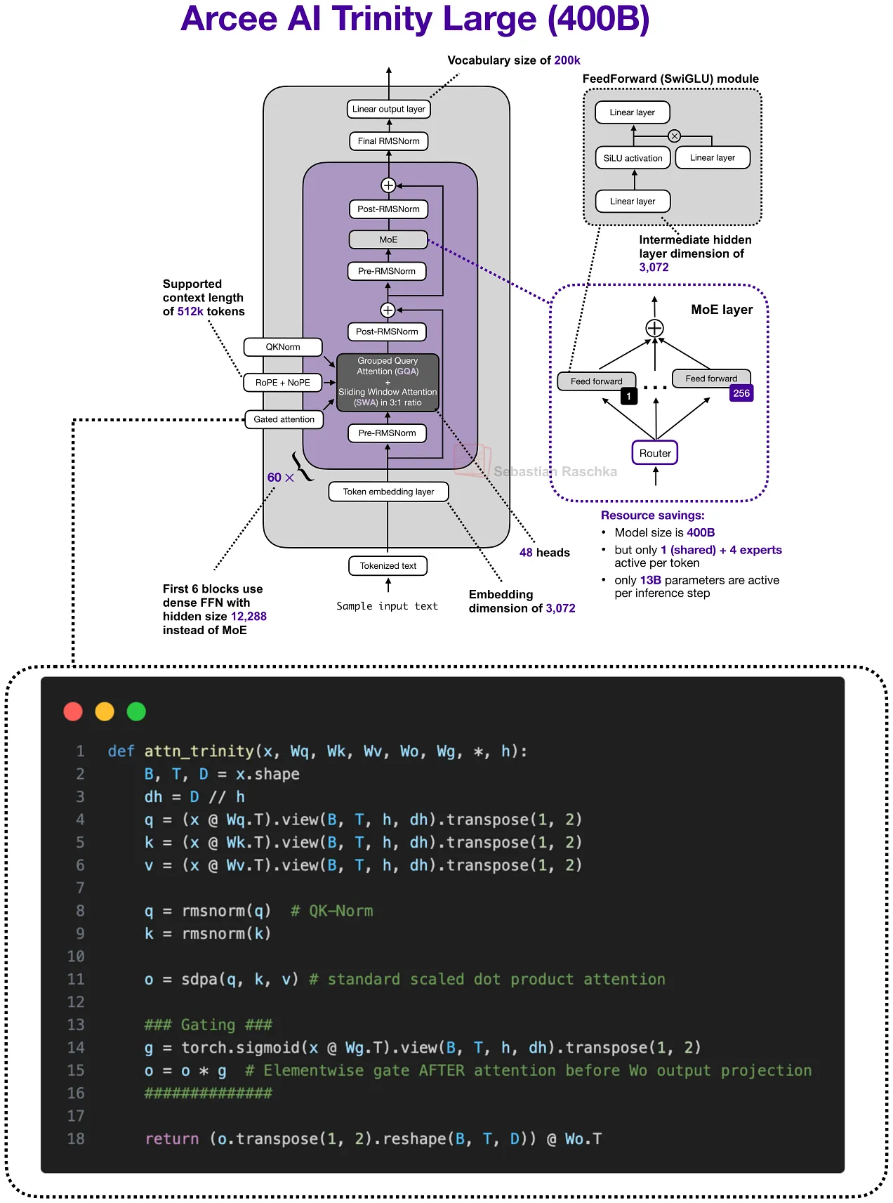 图 22:Trinity Large 是一个很好的对比,因为门控注意力机制并非 Qwen 独有(稍后会详细介绍)。在这里,门控机制出现在缩放点积注意力输出之后、输出投影之前,采用的是不同的长上下文架构(原始出处:《A Dream of Spring for Open-Weight LLMs》)。